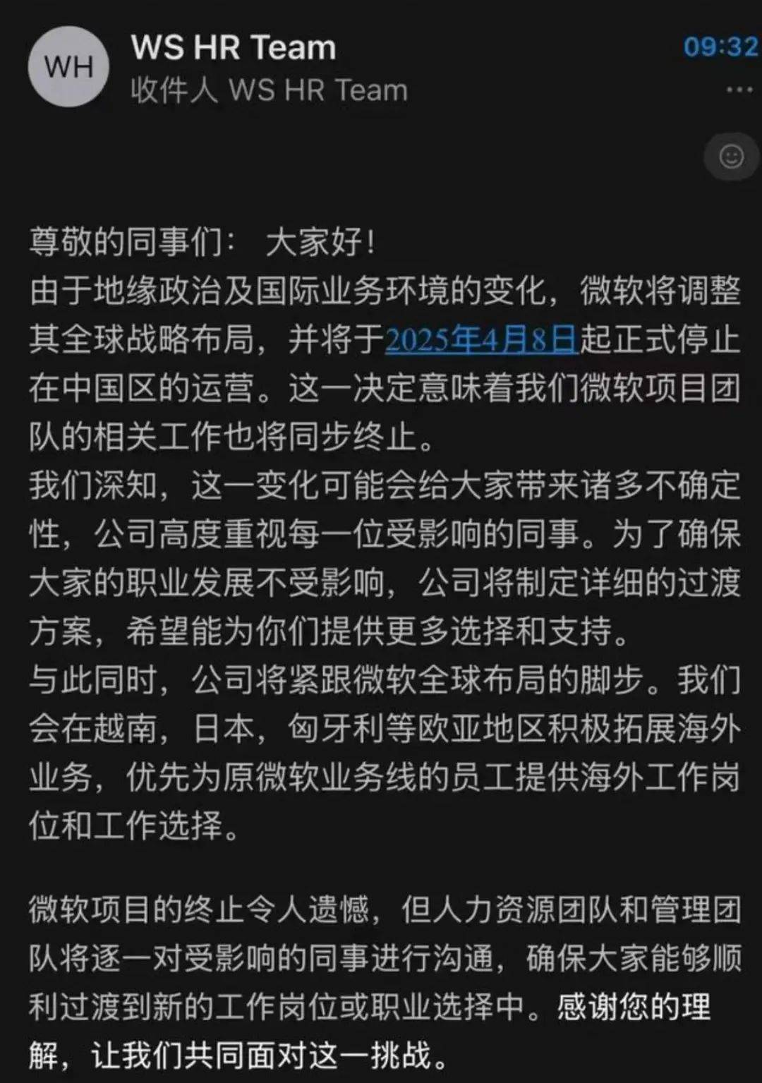 HR团队发出的邮件中写道:“由于地缘政治及国际业务环境的变化,微软将调整其全球战略布局,并将于2025年4月8日起正式停止在中国区的运营。这一决定意味着我们微软项目团队的相关工作也将同步终止。”