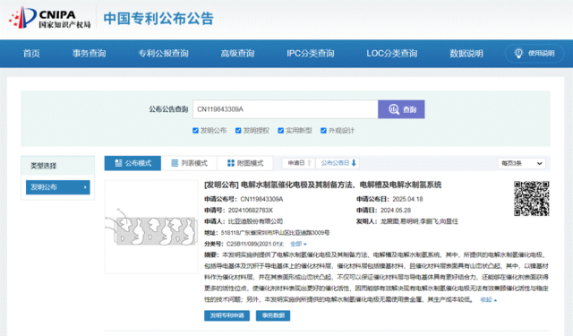 4月24日,国家知识产权局显示,由比亚迪股份有限公司申请的电解水制氢催化电极及其制备方法、电解槽及电解水制氢系统专利公布,申请公布号CN119843309A。截至目前,比亚迪氢能相关专利数量突破60项,涵盖电解槽设计、储氢装置、燃料电池催化剂等核心领域。