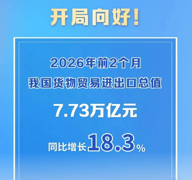 据海关统计,2026年前2个月,我国货物贸易进出口总值7.73万亿元人民币,同比(下同)增长18.3%。其中,出口4.62万亿元,增长19.2%;进口3.11万亿元,增长17.1%。
