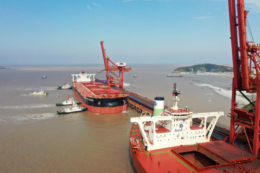 两艘40万吨矿船靠泊宁波舟山港鼠浪湖矿石中转码头(无人机照片)。新华社发(沈磊 摄)