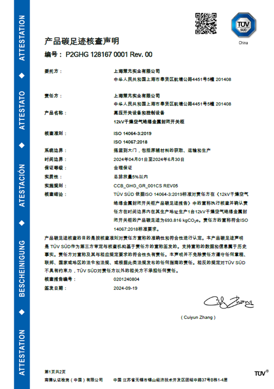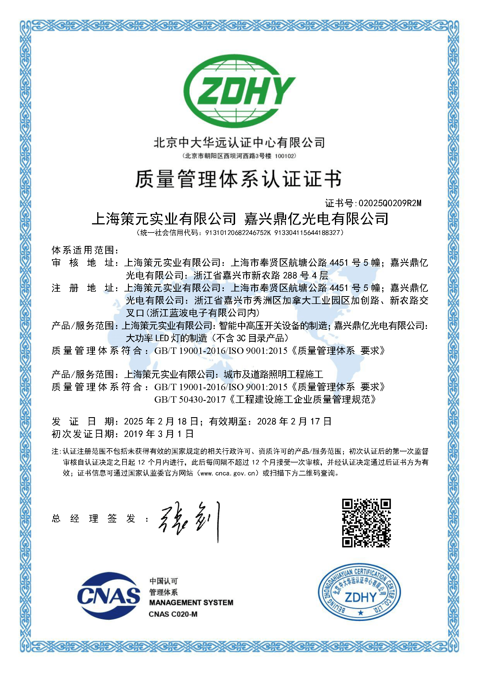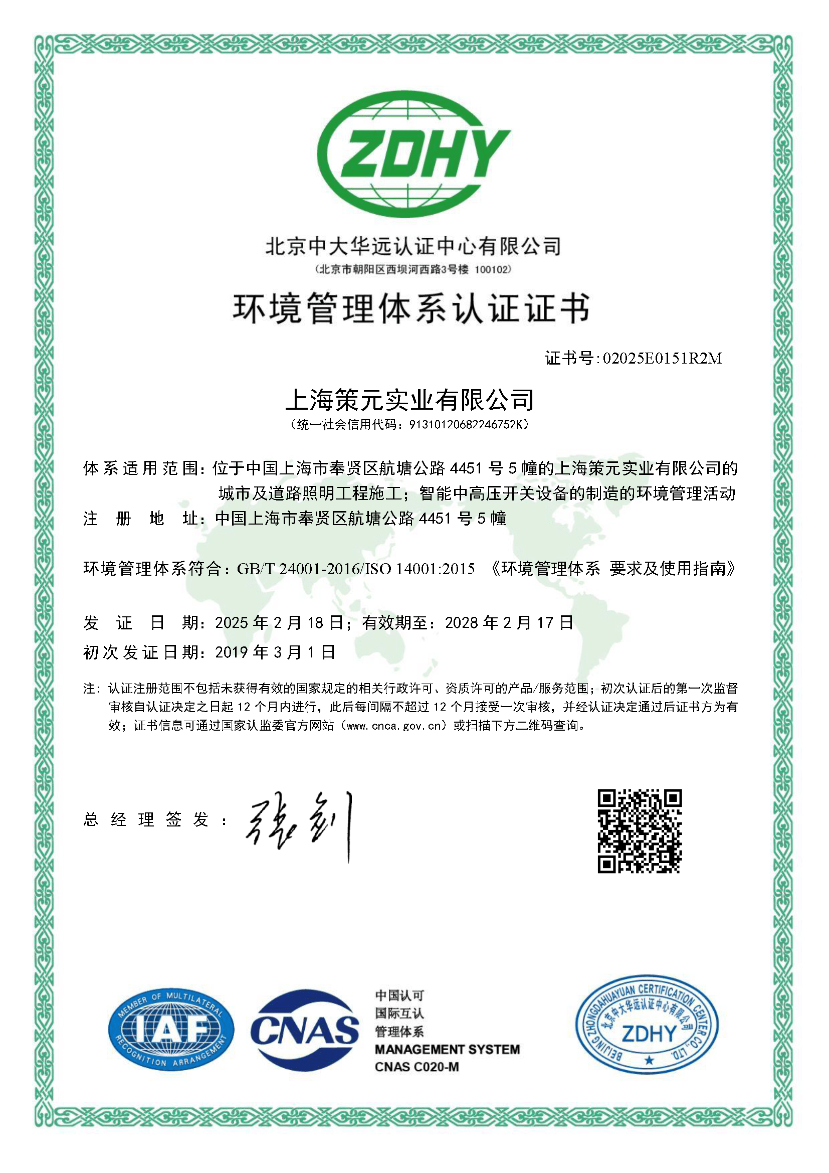 多年砥砺琢磨,上海策元建立了一条一流高效的生产线和可靠的质量管理体系,拥有全自动激光焊接机器人、数控冲压机、数控折弯机、数控母排加工机、全自动检漏重启设备及专用气体绝缘设备组装的洁净车间,公司了通过了IS09000质量管理体系认证、IS014001环境管理体系认证、IS045001职业健康安全管理体系认证及ISO 50001能源管理体系,同时取得了碳足迹评估报告、产品碳足迹证书、碳中和证书,实现了环保引领下的技术创新。截至2024年,上海策元有上千台环保开关设备在国内各地区投入运行,在杭州萧山机场枢纽铁路等重点工程中得以应用并收获好评,同时产品也远销海外至迪拜(阿联酋)、珀斯(澳大利亚)等地区。此外策元的LED灯产品在国内市政工程、高端网球场、核电系统中应用广泛;无人机反制系统取得了国家无委颁发的《反无人机无线电主动防御设备委托检测报告》及工信部颁发的《无线电发射设备型号核准证》,是国内仅有通过认证的几家单位之一。
