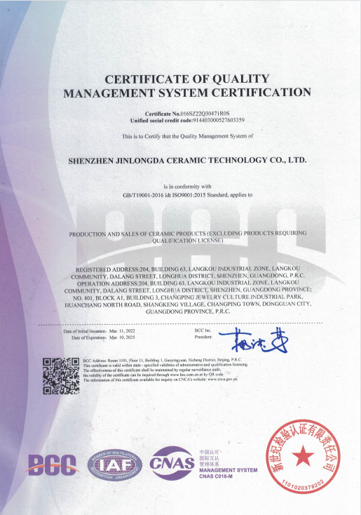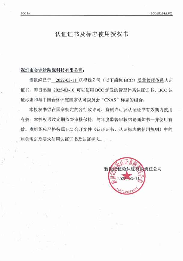 在过去的一年中,在全体成员的团结拼博,努力备斗下,我们的产能达突破3500万。主要在半导体30%和新能源40%行业带来利收。在企业的发展过程中,公司秉承“诚信、专业、共赢”的经营理念,坚持用户至 上、质量第一,以科技服务客户,坚持技术进步、不断创新、不断超越的精神,已经成为一家在特种陶瓷行业技术领先的企业。深圳市金龙达陶瓷科技有限公司愿与社会各界同仁携手共进,共同发展。欢迎广大企业、用户与我们联系,我们将用最好的产品, 为客户提供最好的服务!