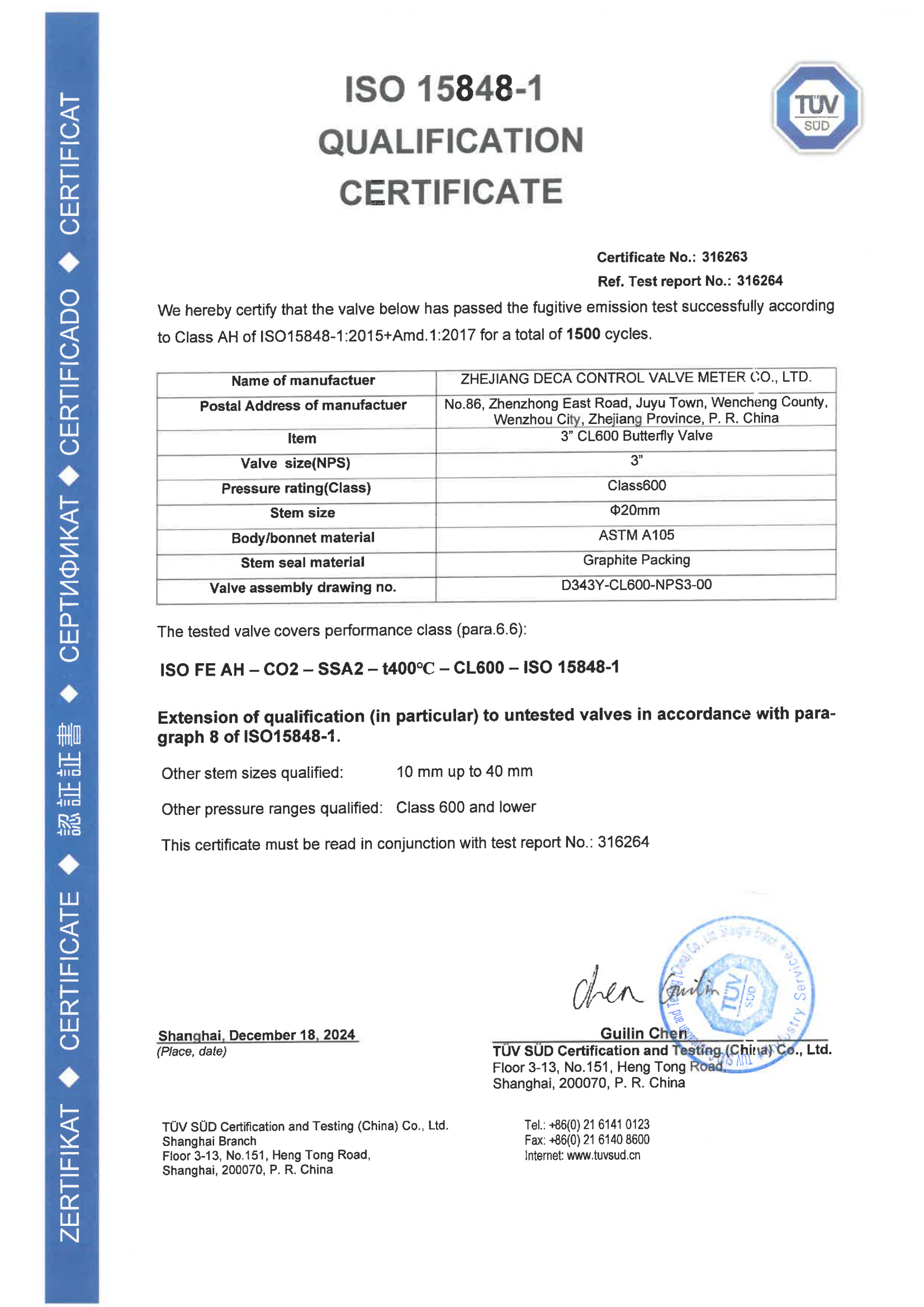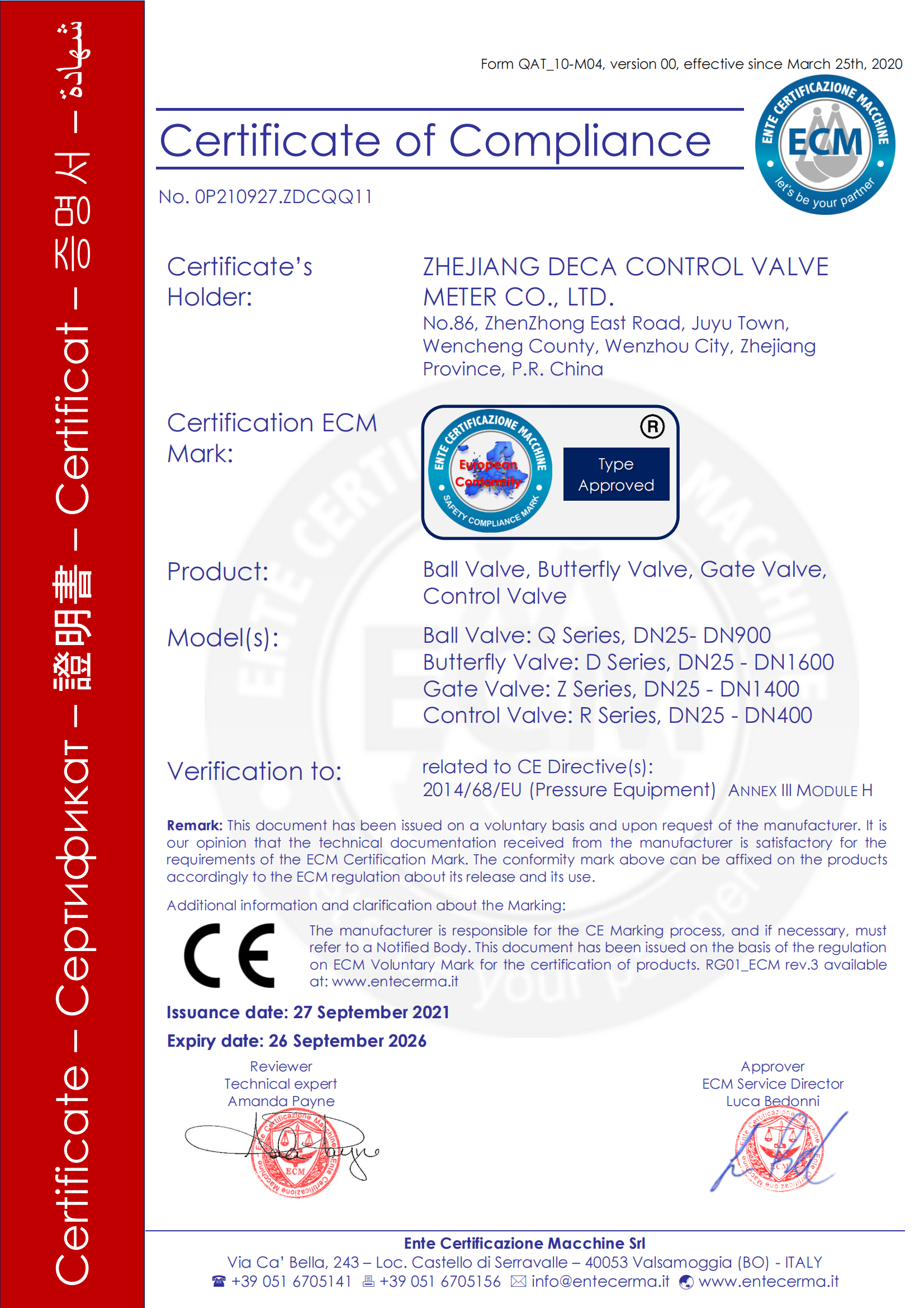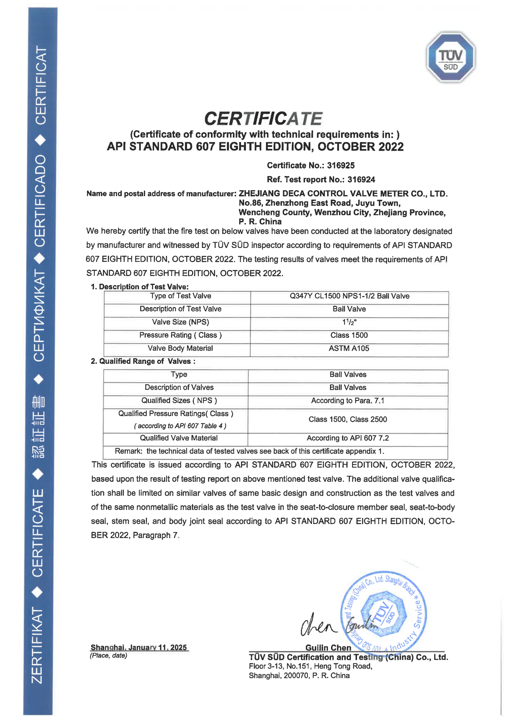 本公司已先后通过中华人民共和国特种设备制造(压力管道元件)A1、A2、B级许可证,ISO9001国际质量体系认证,美国石油学会API6D、API600、API609认证,API607、API6FA阀门耐火试验认证,德国TUV产品安全功能等级SIL3认证,ISO 15848-1德国TUV低泄漏认证,欧亚经济联盟EAC认证,欧盟CE认证,取得环境管理体系认证证书ISO14001、职业健康安全管理体系认证证书ISO45001,HSE健康安全环境、管理体系评审证书;2018年主持起草并发布浙江制造团体标准《石油、石化、天然气及相关工业用气动调节阀》、《石油、石化及相关工业用气动球阀》;2019年取得文成县县长质量奖,温州市两化融合示范企业,2020年通过浙江制造品字标认证、参与制定《直行程电动执行机构》、《低温蝶阀》两项团体标准、《工业阀门的逸散性试验》、《工业阀门 压力试验》两项国家标准。公司先后获得77项国家专利(12项发明、60项实用新型、3项软件著作权、2项瑞安市科技进步奖、2项海外发明专利,1项新产品被列入瑞安市科技计划,22个产品通过省级新产品鉴定,1项产品列入温州市专利产业化,2017、2018、2019、2020年连续4年获得文成种子资金项目,1项新产品列入温州市重大项目。