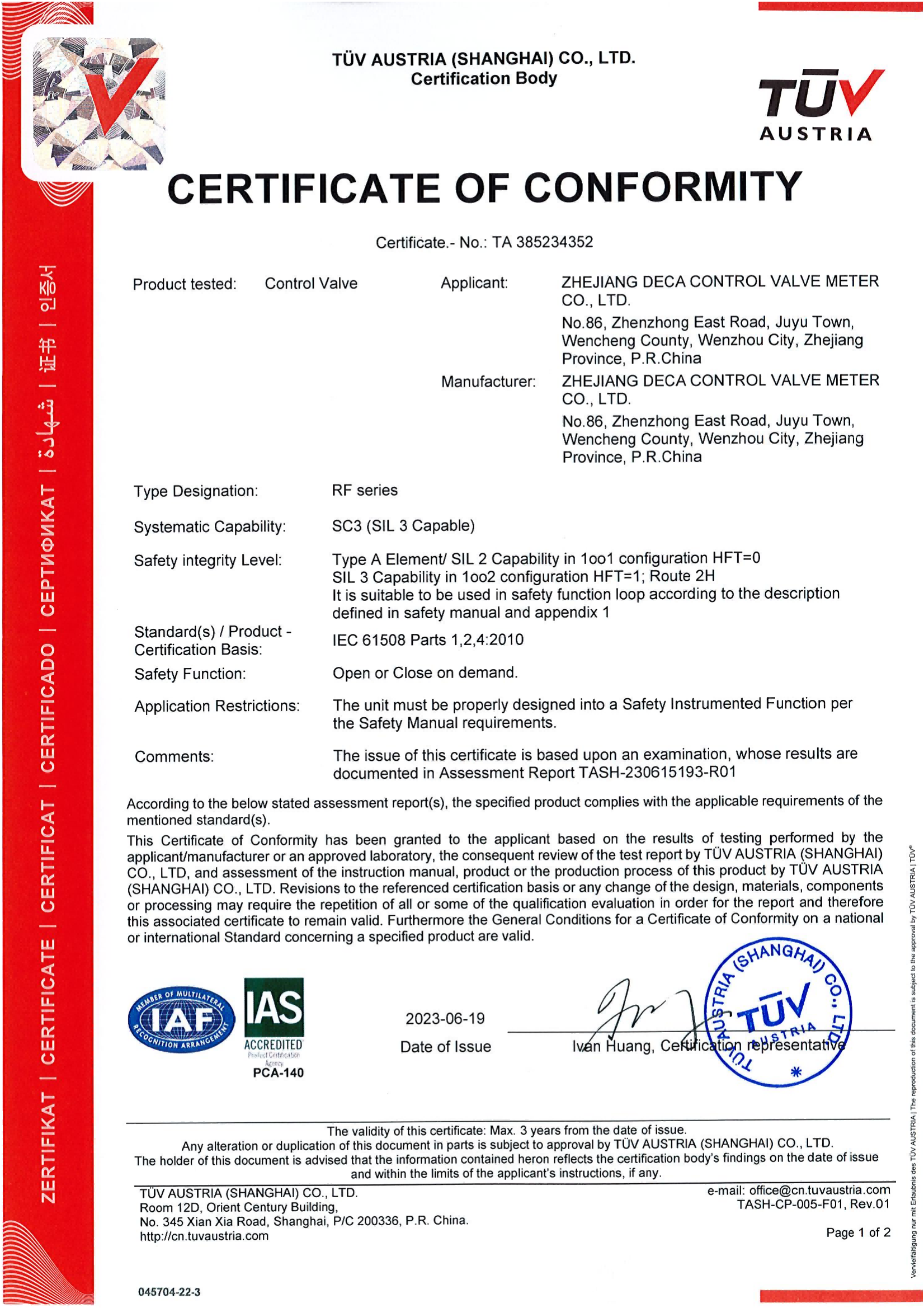 浙江德卡控制阀仪表有限公司成立于1972年,是国家高新技术企业,专门从事控制阀的设计研发、生产销售、运保和检维修,产品包括:调节阀、闸阀、球阀、蝶阀、低温阀以及特殊阀门。我们也是SINOPEC, CNPC, CNOOC, CNAFG, CNCC, SPCL,Rosneft Oil,Tatneft 0il等公司的供应商。公司坐落于山清水秀的浙江省温州市文成县经济开发区,厂区占地面积近39000平方米,建筑面积33000平方米。面积33000平方米。