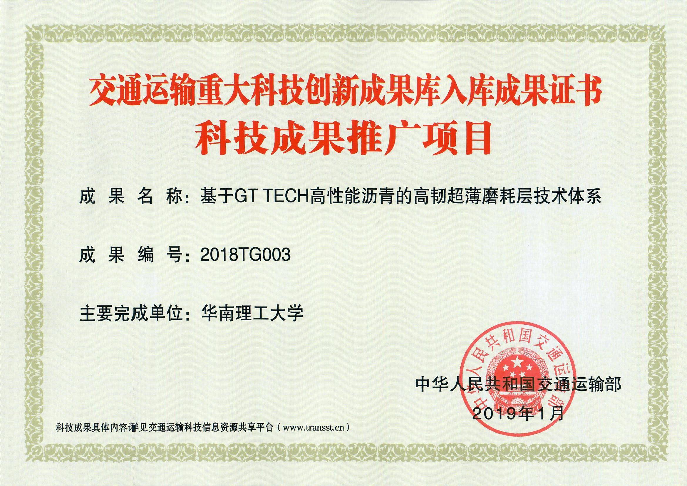 自主研发的“高韧超薄沥青磨耗层”,突破了1cm级别高性能超薄沥青磨耗层技术卡脖子问题。本技术体系已在上海延安路、港珠澳大桥人工岛通道、北京国家授勋馆周边道路、杭州亚运保障道路、广州中心城区道路、澳门城区主干道及刚果金· 金沙萨-马塔迪公路重建工程、南非能源冶金经济特区菱镁矿区道路、塞内加尔PK2·BRT项目等国内外600余个重要路段实施。遍及广东、上海、北京、澳门等28个省市、地区及一带一路沿线国家,实施面积逾3000万平米。