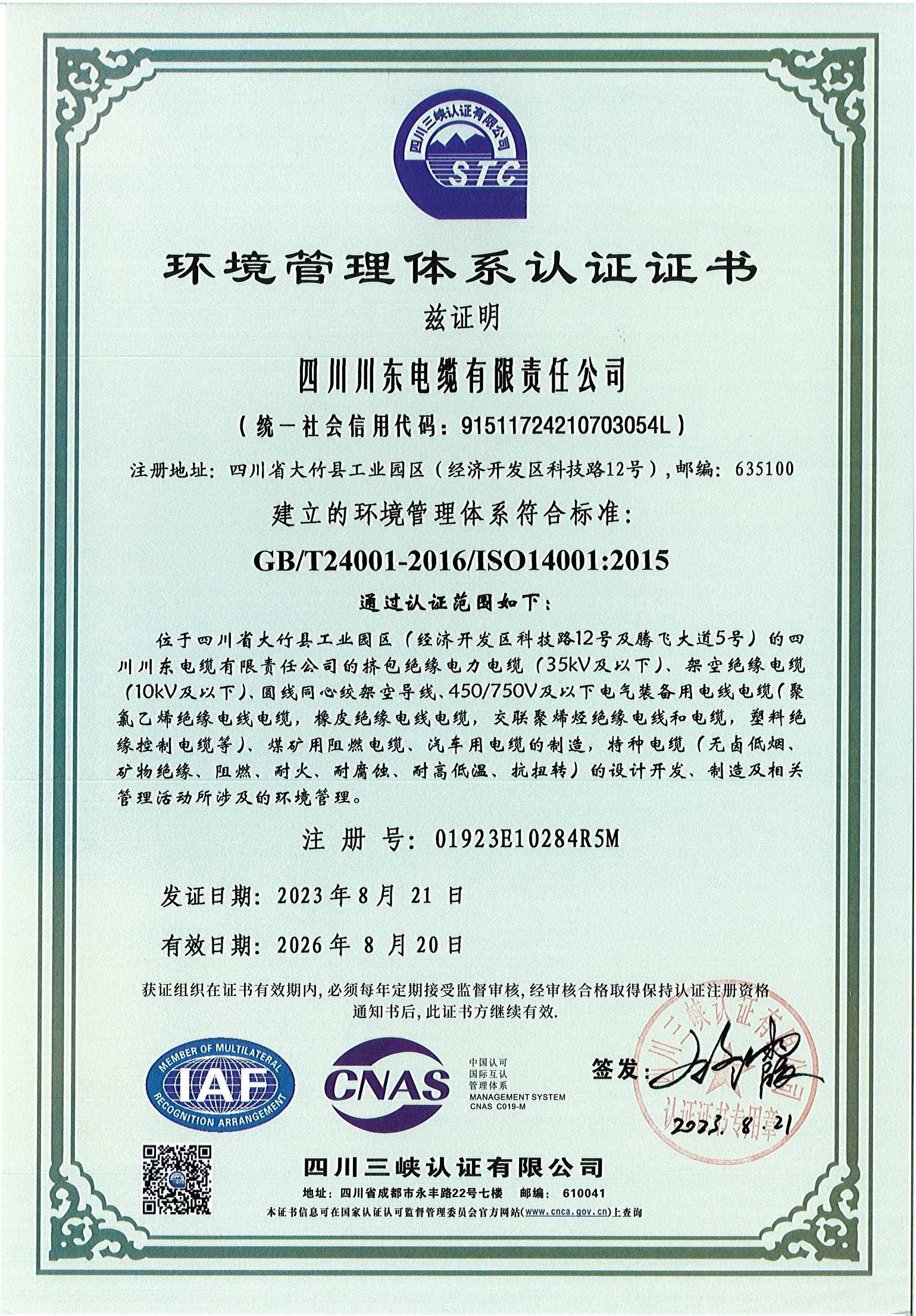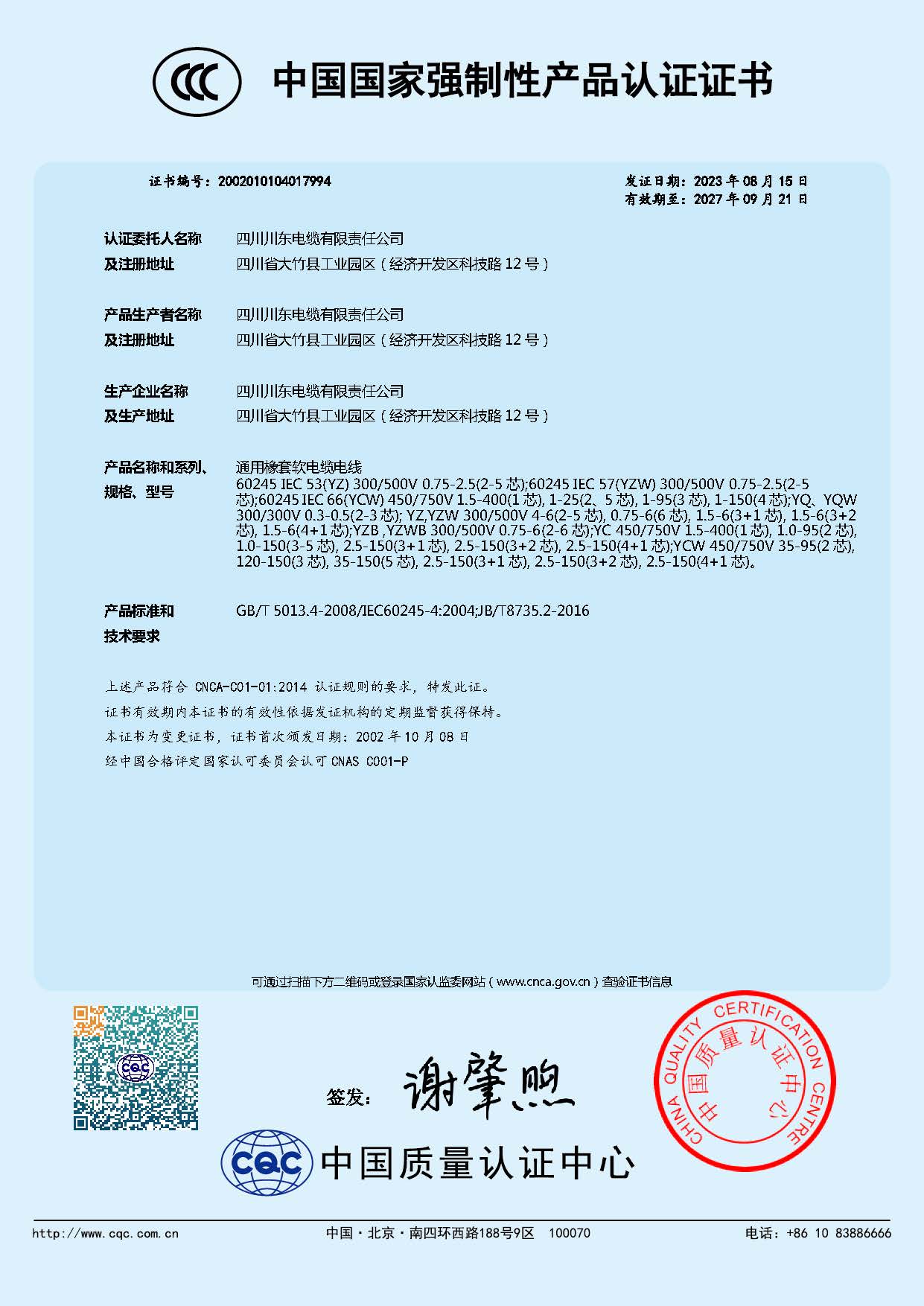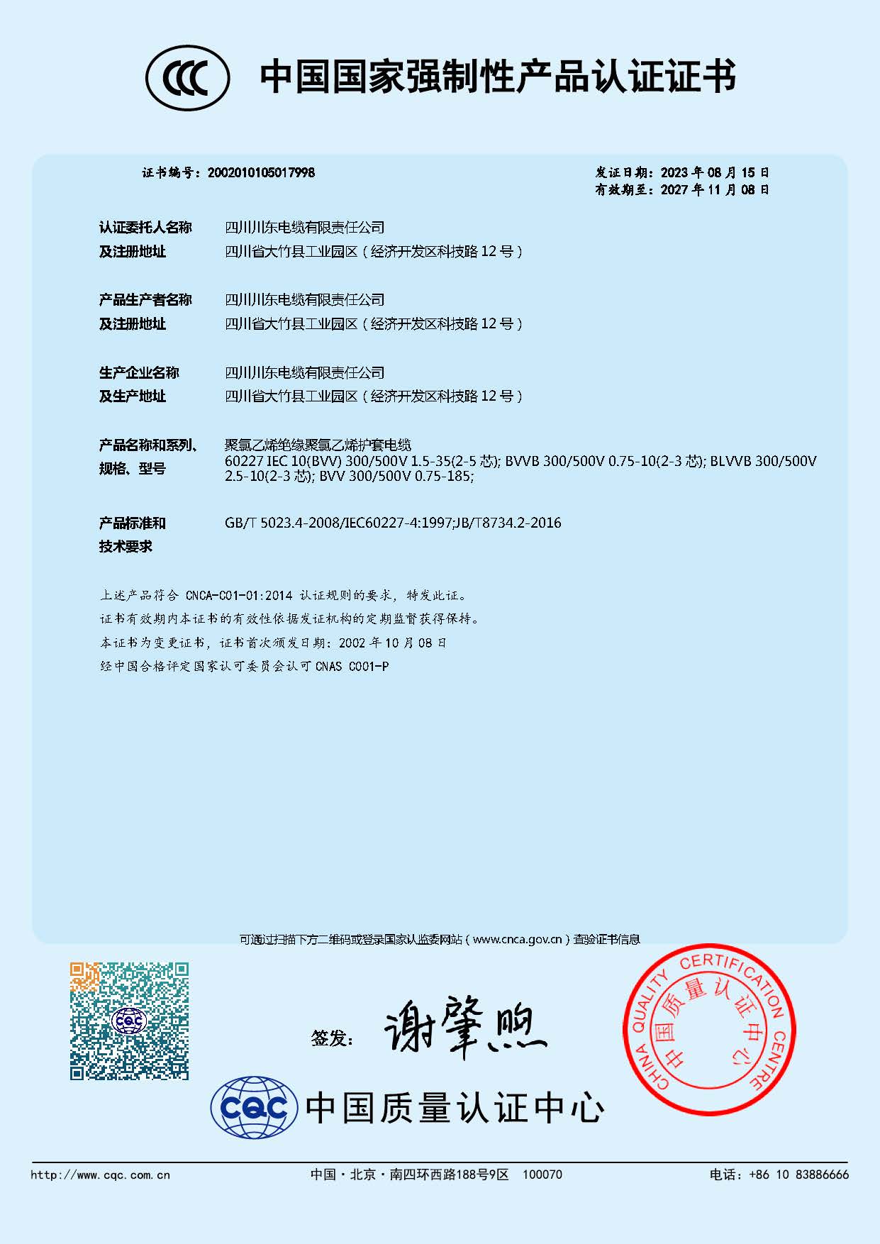 四川川东电缆有限责任公司位于四川省大竹县工业园区,创建于1970年,占地面积210亩。为中国电器工业协会电线电缆分会副理事长单位、国家高新技术企业、“国家级守合同重信用企业”、 “四川名牌产品” 和 “达州市第—届政府质量奖”企业,国家劳动和社会保障部批准的 “机械行业职业技能鉴定线缆四川站”。