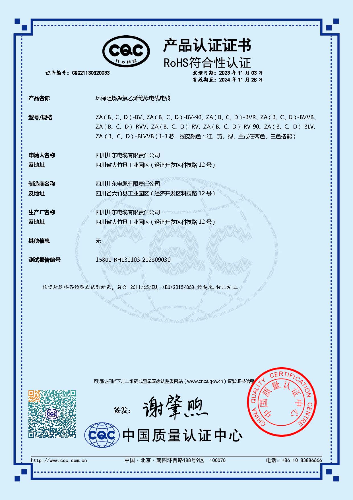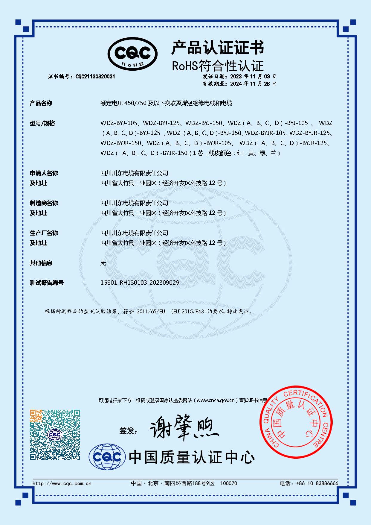 公司主要生产电气装备用电线电缆、电力电缆、橡套电缆、铝合金电力电缆、电动汽车充电电缆等,年生产能力30万公里。公司通过了ISO 9001:2015质量管理体系认证、ISO 14001:2015环境管理体系认证、ISO 45001:2018职业健康安全管理体系认证、CCC认证、工业产品生产许可证认证、矿用产品安全标志证书认证、欧盟标准RoHS认证、中国环保产品认证、Ul认证。