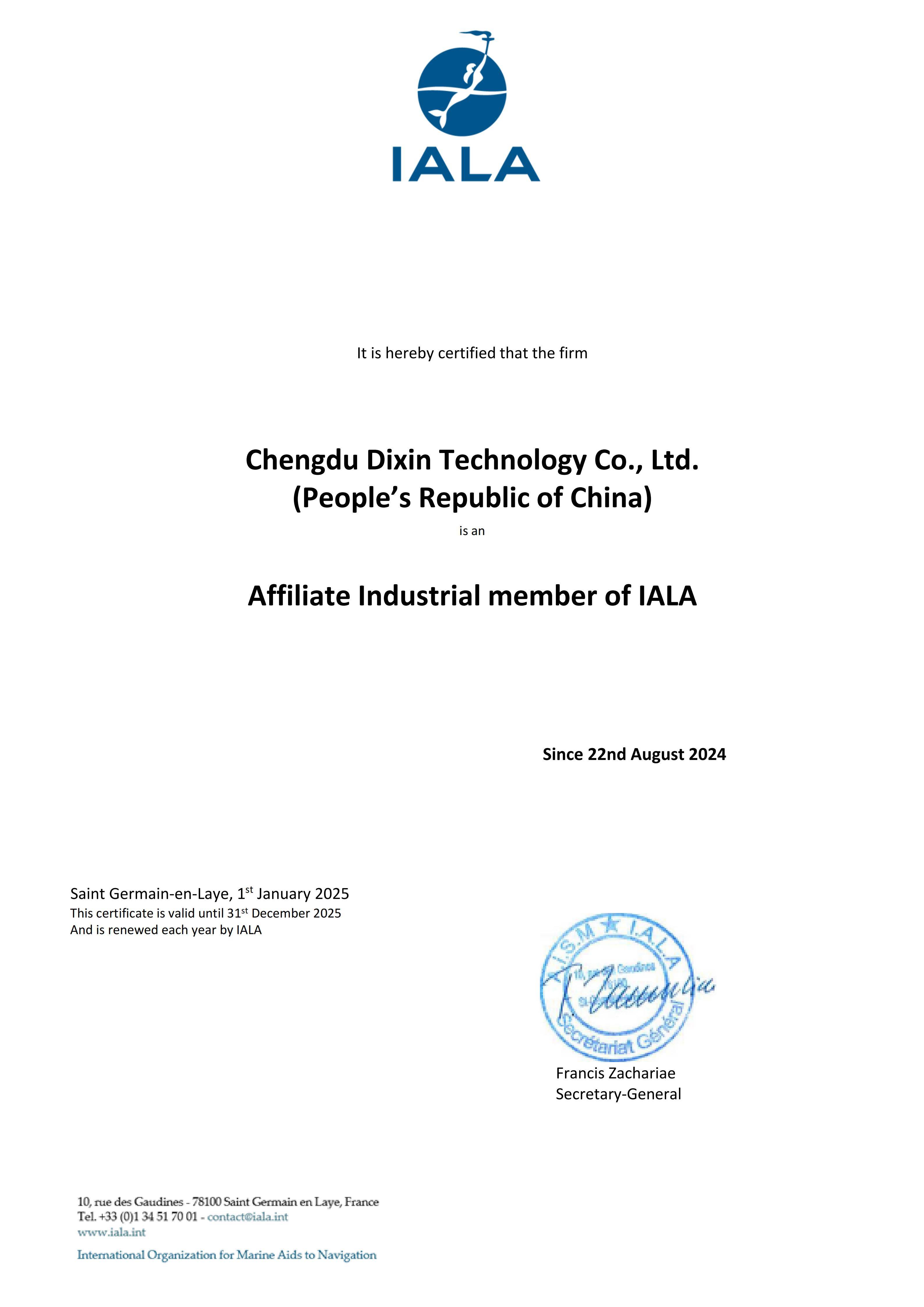成都帝欣科技有限公司成立于2018年,总部位于中国四川省成都市,是一家专注于航海保障产品的研发、生产、销售及技术服务的专业企业,自成立以来,我们始终以 “技术赋能航海安全” 为核心,凭借扎实的技术实力、国际认可的合规标准与全周期服务能力,已成为全球海事领域值得信赖的合作伙伴。公司是IALA(国际航标协会)是会员,获得国家级高新技术企业认定,拥有相关技术专利三十余项。