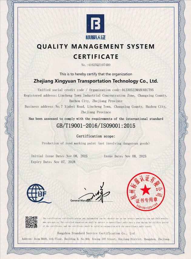 浙江星元交通科技有限公司是浙江省公路学会成员,依托30年核心技术积累,专注于道路标线材料及设备的研发与全球供应。公司成立于2022年,位于浙江长兴的现代化生产基地占地25亩、总投资1亿元,具备年产10万吨热熔涂料、2500吨冷塑涂料及1000台标线设备的生产能力。旗下拥有“天天见”、“天珠”及“Mate Star”等品牌矩阵,产品涵盖ISO 9001认证的热熔型涂料、冷涂双组份标线涂料以及配套设备,远销亚洲、非洲、中东等50多个国家和地区。公司拥有多项国家专利,提供ODM/OEM服务及全方位技术支持,致力于为全球道路交通安全提供可靠解决方案。