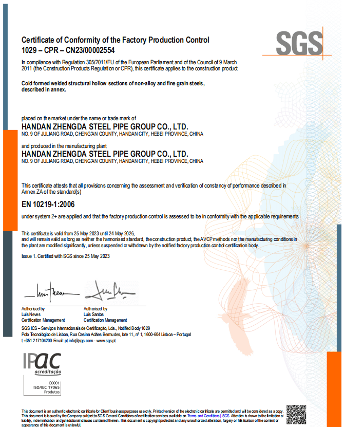 正大制管集团(英文缩写:ZDP)前身为邯郸市正大制管有限公司,成立于2005年8月8日,于2021年改制成立邯郸正大制管集团股份有限公司。是一家以高频直缝焊管、热浸镀锌圆管、螺旋缝焊管、方矩形钢管、热浸镀锌方矩管、钢塑复合管、3PE防腐管制造、销售为主导,集科、工、贸为一体的现代化综合型企业。旗下拥有邯郸、迁安、山西、云南四大生产基地。公司自成立以来,秉承“做正派人、干大事业”的企业精神,遵循“规模、规范、规矩”的立厂之本,历经20年发展,现可年生产各类规格“天虹”“吉立”品牌钢管1000多万吨,销售网络遍布全国、服务全球,其中公司产品热镀锌方矩管自2018年以来连续多年全国销量第一。