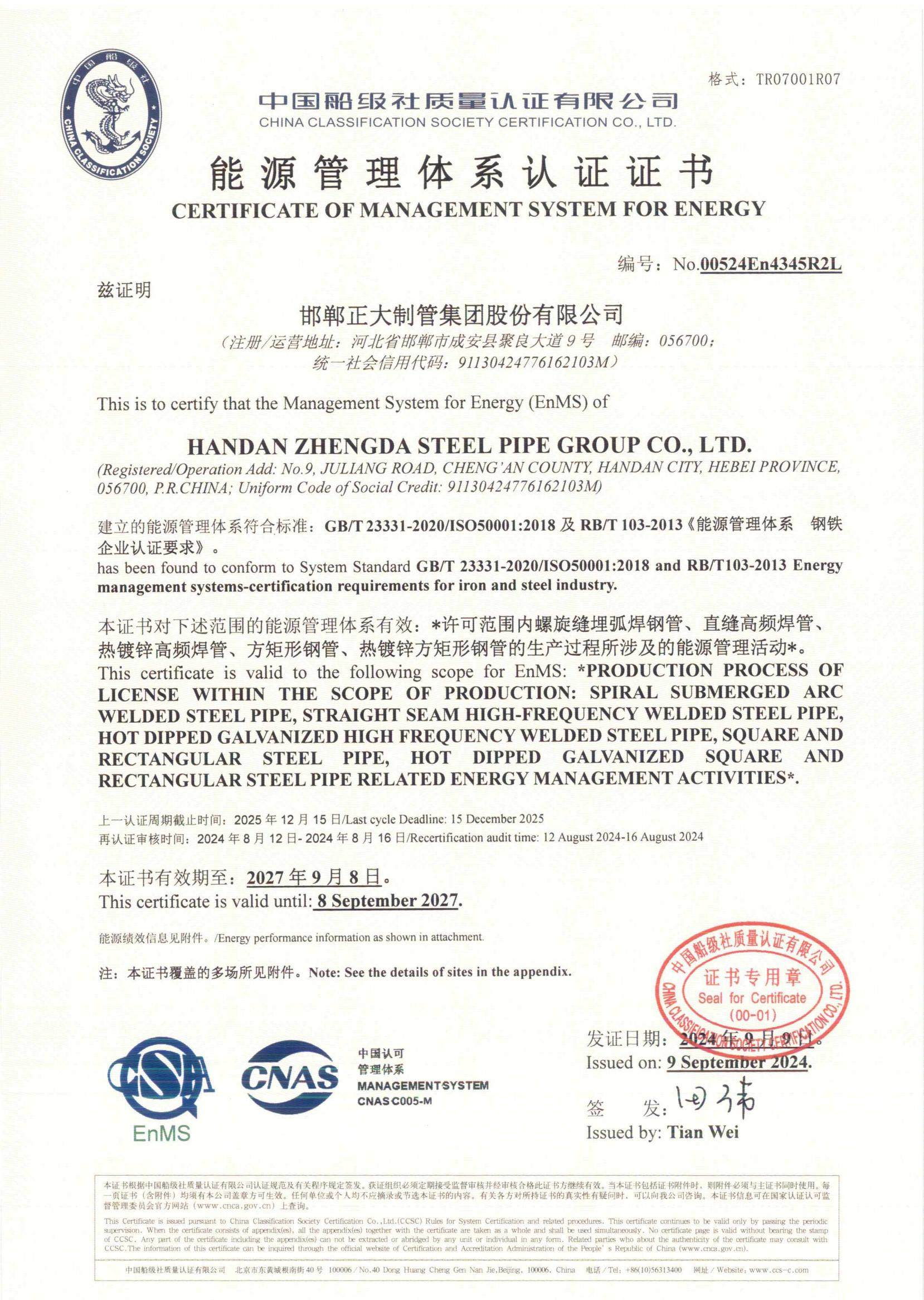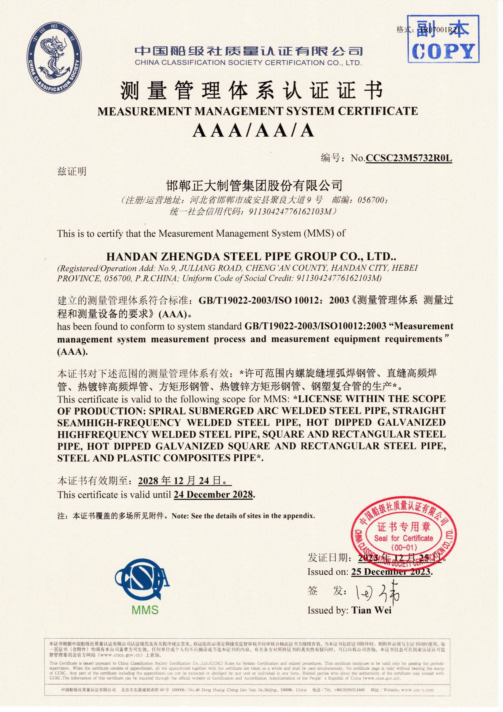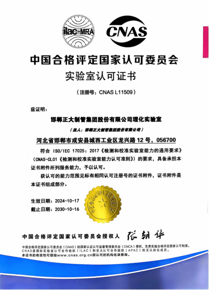 正大制管集团是深耕钢管制造领域头部企业,拥有国家CNAS实验室,是全国质量诚信标杆企业、全国百佳质量检验诚信标杆企业,获国家高新技术企业、全国守合同重信用企业、国家两化融合管理体系贯标企业、国家绿色工厂、国家知识产权优势企业、中国制造业500强、中国民营企业500强、中国品牌500强、京津冀100强、河北省百强企业、河北产业集群龙头企业、中国民营企业文化建设三十标杆单位等荣誉称号。自主品牌“天虹”获中国驰名商标、河北名片、河北省著名商标、河北省优质产品、河北省名牌产品等荣誉称号。公司先后通过中国船级社质量管理、环境管理、职业健康安全管理、能源管理、测量管理、知识产权管理、碳管理七体系认证,美国石油学会API5L认证、美国安全检测实验室UL认证、欧盟CE 认证。