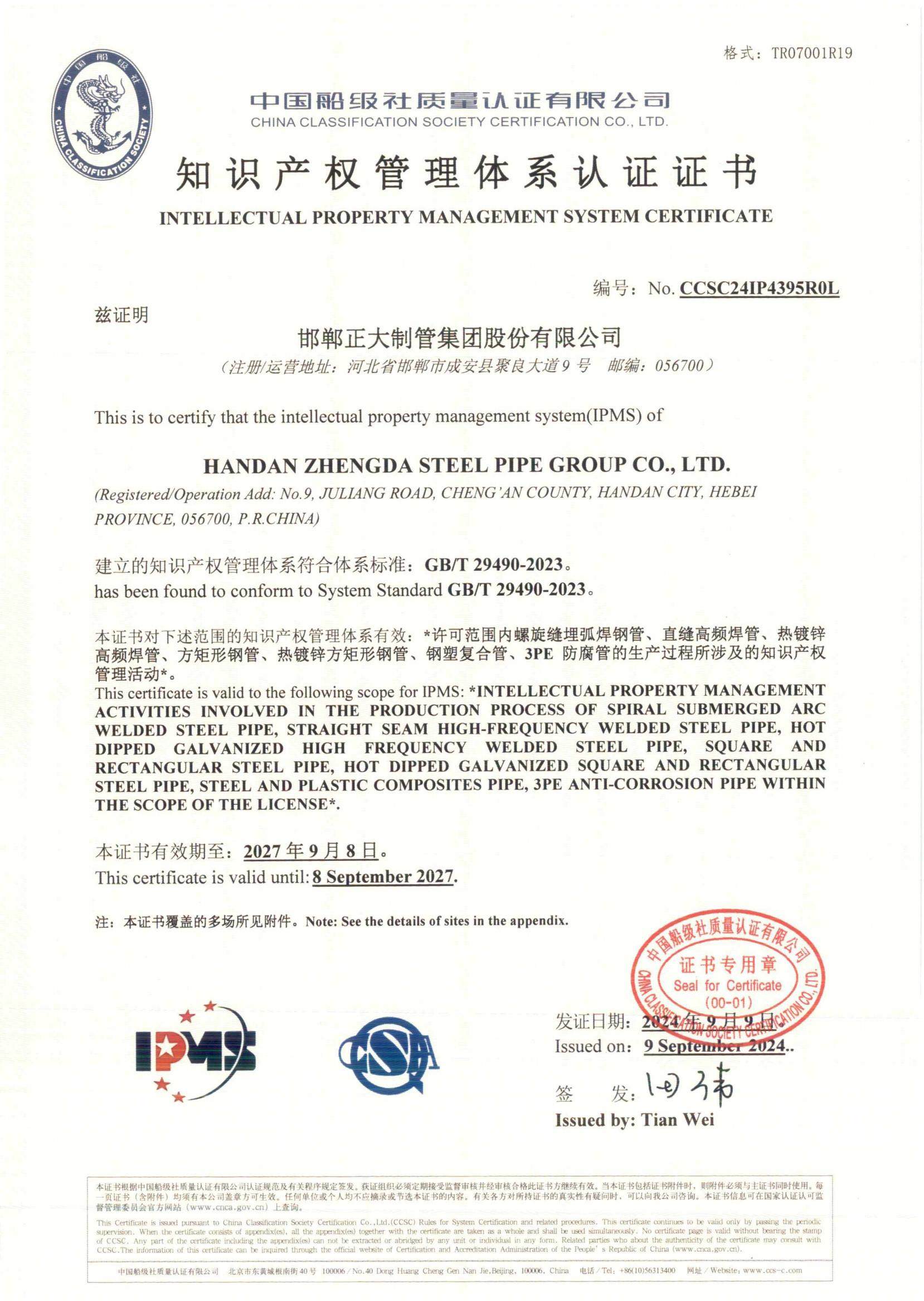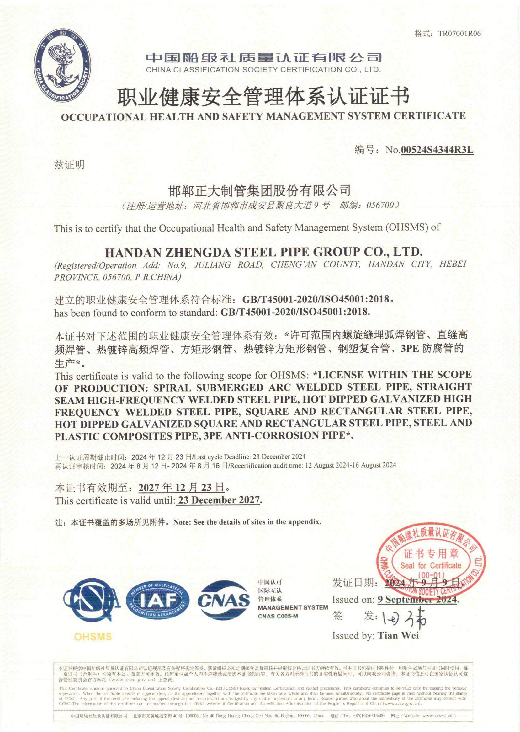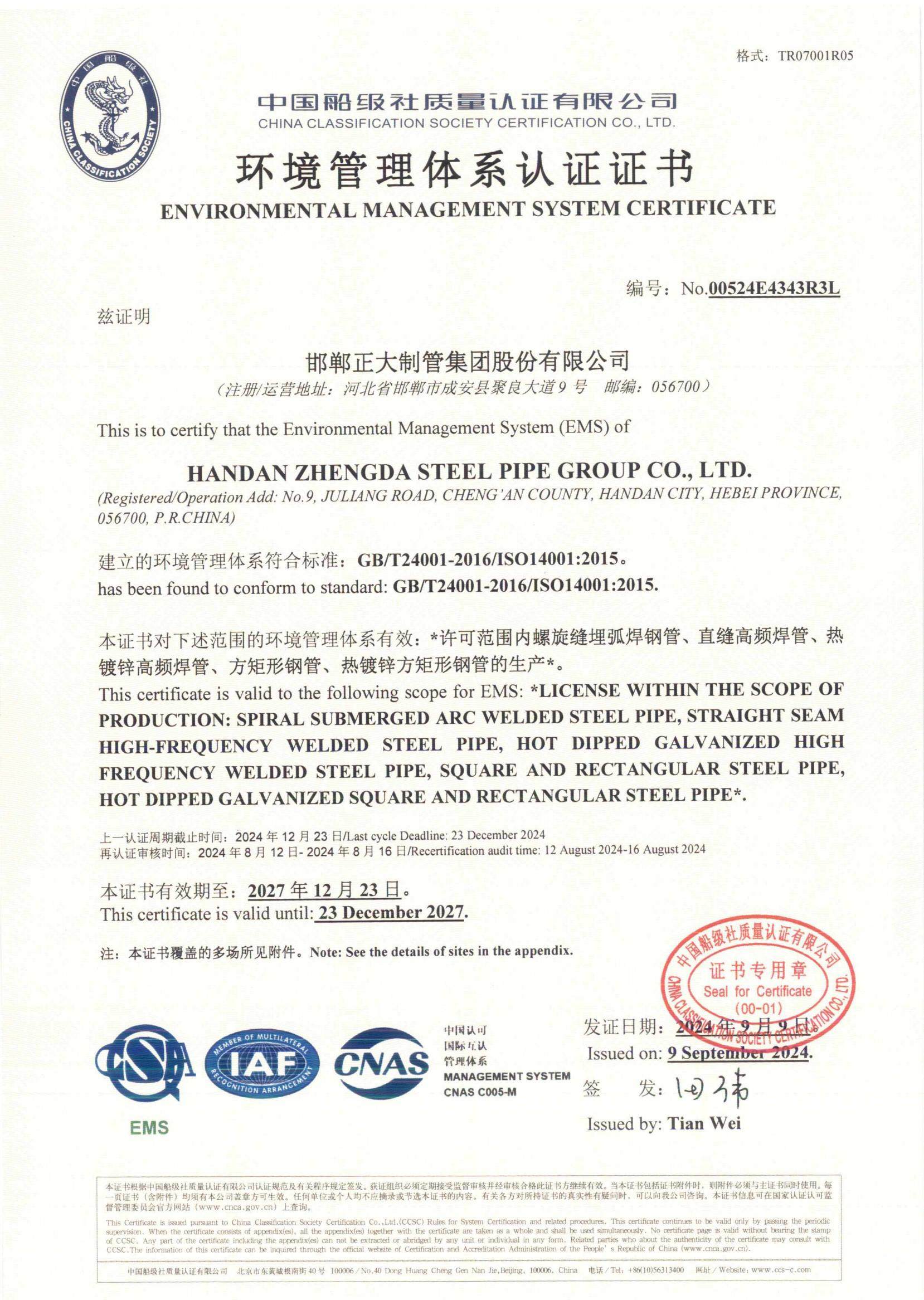 正大制管集团是深耕钢管制造领域头部企业,拥有国家CNAS实验室,是全国质量诚信标杆企业、全国百佳质量检验诚信标杆企业,获国家高新技术企业、全国守合同重信用企业、国家两化融合管理体系贯标企业、国家绿色工厂、国家知识产权优势企业、中国制造业500强、中国民营企业500强、中国品牌500强、京津冀100强、河北省百强企业、河北产业集群龙头企业、中国民营企业文化建设三十标杆单位等荣誉称号。自主品牌“天虹”获中国驰名商标、河北名片、河北省著名商标、河北省优质产品、河北省名牌产品等荣誉称号。公司先后通过中国船级社质量管理、环境管理、职业健康安全管理、能源管理、测量管理、知识产权管理、碳管理七体系认证,美国石油学会API5L认证、美国安全检测实验室UL认证、欧盟CE 认证。
