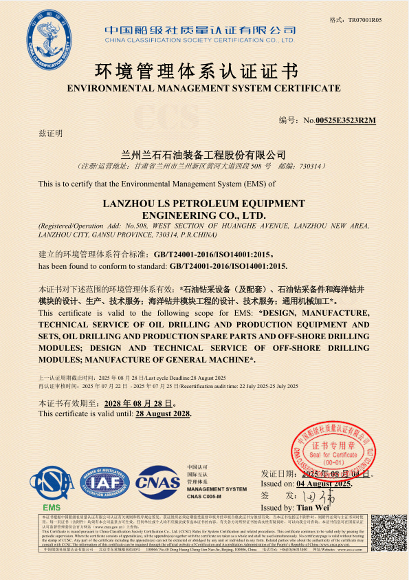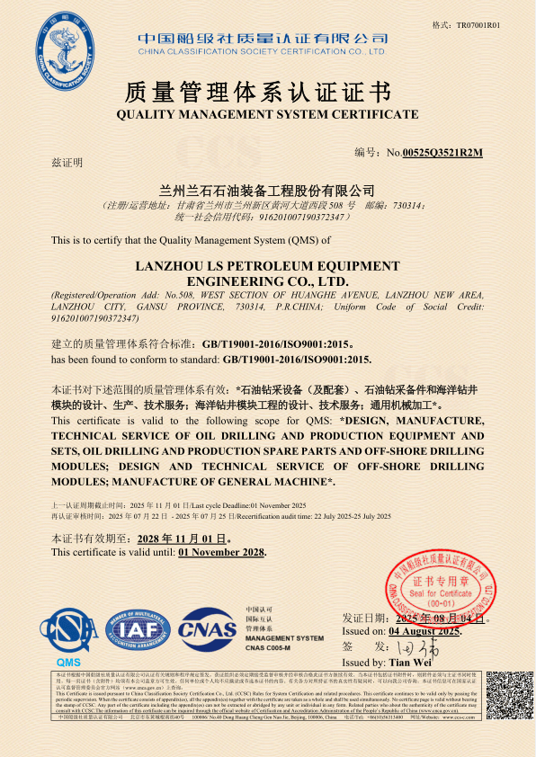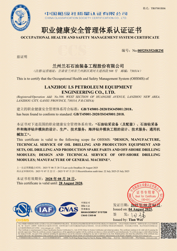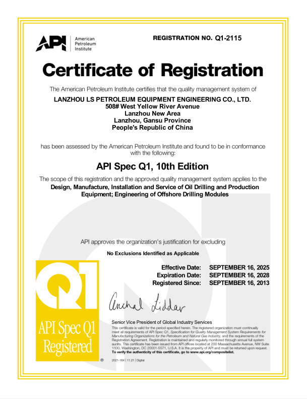 公司持有API Q1质量体系认证,4F、7K、8C、11E会标使用许可证,ISO9001质量管理体系认证、ISO14001环境管理体系认证、GB/T45001职业健康安全管理体系认证证书。所有产品均严格按照管理体系的控制进行设计、制造、检验和售后服务。