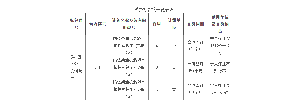 国家能源集团2025年第二批煤炭设备(井下防爆柴油机混凝土车)集中采购项目招标公告第一章 公开招标 1.招标条件 本招标项目名称为:国家能源集团2025年第二批煤炭设备(井下防爆柴油机混凝土车)集中采购公开招标,项目招标编号为:CEZB250207834,招标人为国能(北京)跨境电商有限公司,项目单位为:国家能源集团宁夏煤业有限责任公司,资金来源为自筹。招标代理机构为国家能源集团国际工程咨询有限公司。本项目已具备招标条件,现对该项目进行国内资格后审公开招标。 2.项目概况与招标范围 2.1 项目概况、招标范围及标段(包)划分:本项目划分为1个包次,投标人须按包次投标,不得选择每个包次中的部分货物进行投标。招标范围包括井下防爆柴油机混凝土车的供货、运输及相关服务。(具体标包划分、交货时间、交货地点及设备名称、技术规格、数量等技术参数见《招标货物一览表》) 《招标货物一览表》