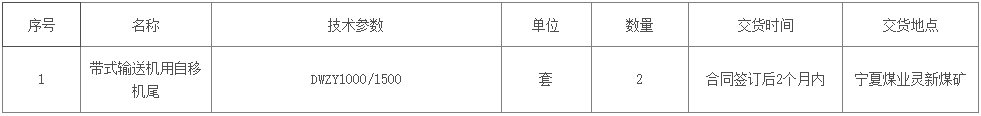 宁夏煤业灵新煤矿2025年9月带式输送机用自移机尾采购公开招标项目招标公告 第一章 公开招标 1.招标条件 本招标项目名称为:宁夏煤业灵新煤矿2025年9月带式输送机用自移机尾采购公开招标,项目招标编号为:CEZB250208799,招标人为国家能源集团宁夏煤业有限责任公司,项目单位为:国家能源集团宁夏煤业有限责任公司,资金来源为自筹。招标代理机构为国家能源集团国际工程咨询有限公司。本项目已具备招标条件,现对该项目进行国内资格后审公开招标。 2.项目概况与招标范围 2.1 项目概况、招标范围及标段(包)划分:本项目共一个包,招标范围包括带式输送机用自移机尾供货、运输及相关服务。(具体标包分、交货时间、交货地点及设备名称、技术规格、数量等技术参数见《招标货物一览表》) 招标货物一览表