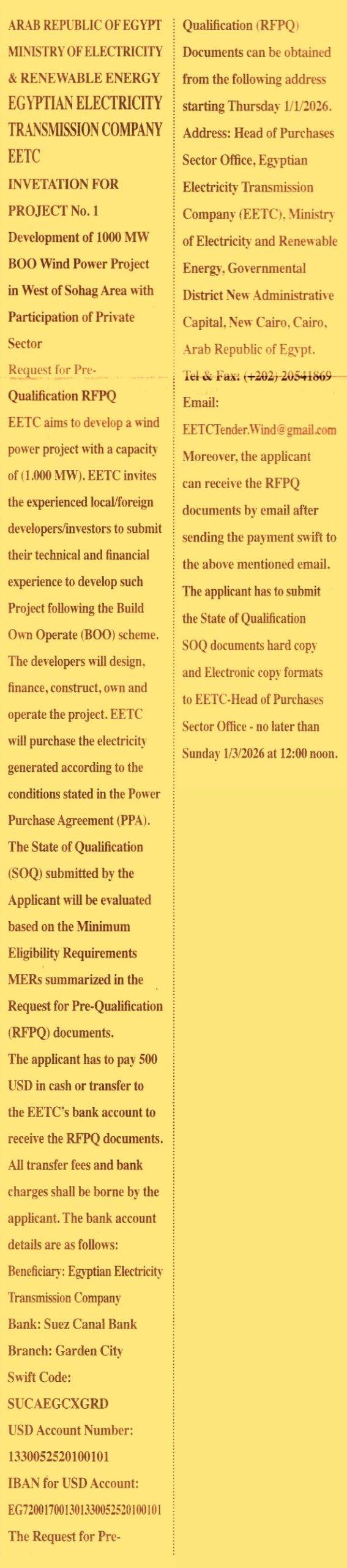 项目名称: 索哈格西部地区1000兆瓦BOO风电项目开发 项目业主/招标方: 埃及电力传输公司 项目模式: 建设-拥有-运营 项目性质: 大型可再生能源发电项目 项目地点: 埃及索哈格西部地区 项目规模: 总装机容量1,000兆瓦 参与方要求: 邀请有经验的本地/外国开发商/投资者参与 项目内容与服务范围: 项目开发: 完成项目可行性研究、环境与社会影响评估、土地获取、并网协议谈判等前期开发工作。 设计: 负责风电场的整体设计,包括风力发电机选型与布置、微观选址、场内集电线路设计、升压站设计、接入系统设计等。 融资: 负责项目所需的全部建设资金和流动资金的筹集,包括债务和股权融资。 采购与建设: 负责所有设备、材料和服务(EPC总承包或分项采购)的采购,并完成风电场的全部建设工作。 运营与维护: 在项目商业运营期内,负责风电场的运行、维护、修理和管理,确保达到购电协议约定的可用率和发电量。 电力销售: 根据与埃及电力传输公司签订的长期购电协议,向埃及电网销售全部所发电量。 关键物资规格与技术框架: 风力发电机组: 预计需要单机容量5-7MW级或以上的现代陆上风电机组,数量约150-200台。技术规格将包括但不限于:适应项目地点风资源和环境条件(如风速、湍流强度、温度、沙尘等)、符合国际电工委员会标准、具备必要的电网适应性(如高/低电压穿越能力、频率响应、无功功率调节等)。 塔筒与基础: 适应特定地质条件的风机塔筒(可能为钢制锥形塔)和基础设计(可能为扩展基础或桩基础)。 电气系统: 集电线路: 35kV或类似电压等级的场内地下或架空电缆网络,连接各风机至升压站。 升压站: 包括中压开关设备、主变压器(将电压升至电网接入点电压,如220kV或500kV)、高压开关设备、保护与控制系统、无功补偿装置、监控系统等。 接入线路: 从项目升压站至电网指定接入点的输电线路(可能由开发商负责建设或由电网公司负责,需明确)。 土建与辅助设施: 包括风机基础、箱变基础、升压站土建、场内道路、施工临时设施、运营维护中心等。 参与方要求: 邀请有经验的本地/外国开发商/投资者参与 资格预审要求: 申请人需提交资格声明文件,其评审将基于资格预审文件中规定的最低资格要求。 资格预审文件费用: 500美元 付款方式: 现金支付或转账至埃及电力传输公司指定银行账户。所有转账手续费和银行费用由申请人承担。 银行账户信息: 受益人: 埃及电力传输公司 银行: 苏伊士运河银行 分行: 花园城市分行 SWIFT代码: SUCAEGCXGRD 美元账号: 1330052520100101 美元账户IBAN: EG7200700130130082520100101 资格预审要求: 申请人类型: 有经验的本地或外国开发商/投资者。可以是单一实体,也可以是联合体。 文件提交: 需提交完整的资格声明文件,包含证明符合上述要求的详细证据。 采购流程阶段: 当前阶段为资格预审。通过预审的申请人将被列入短名单,有资格参与后续的项目建议书邀请阶段。 |
