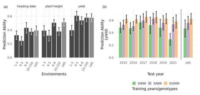 研究第一作者Moritz Lell解释,分析表明不同测试序列可灵活组合用于基因组预测,且训练集规模增加(至少达约4000个基因型)时预测准确率会持续提升,但进一步增加训练集,预测值只会略有增加。对此,Reif教授强调,若在数据集中包含更多环境,有望克服这一瓶颈,更好地利用大数据在育种研究中的潜力。