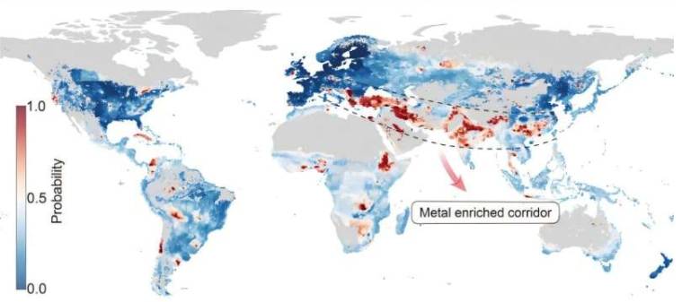 该研究是最全面的土壤污染测绘工作之一,研究团队结合机器学习进展和来自1493项研究的796084个土壤浓度数据,系统评估了全球土壤中砷、镉、钴、铬、铜、镍和铅这七种有毒金属的污染情况。研究发现,农业土壤中镉含量常超阈值,特别是地图中红色阴影区域。此外,研究还描述了一条从南欧延伸至中东、南亚的“金属富集走廊”,这些地区的农业生产力与采矿业、工业活动及有限监管的历史紧密相关。