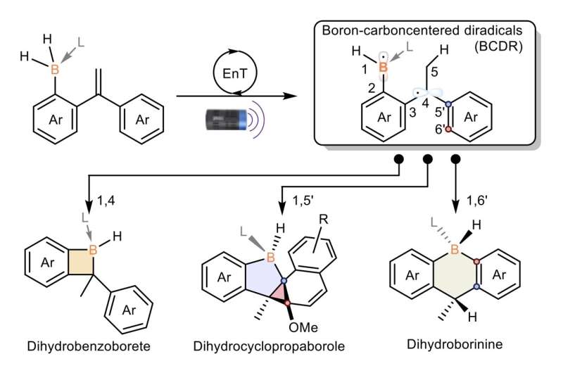 在最近的研究中,该团队开发了一种新颖而高效的四元硼环合成方法,该方法通过解锁硼碳双自由基(BCDR)化学反应得以实现。三重态能量转移催化通过BCDR的分子内偶联生成空气稳定的苯并硼烯。