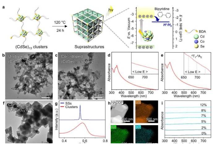 为解决这些关键难题,研究团队开发了三大创新技术:首先设计了三维自排列超结构,通过精确控制团簇的空间排列增强稳定性;其次采用配体交联技术,在保持单个团簇特性的同时实现结构强化;最后创新性地在团簇内部掺杂钴离子(Co²⁺),显著提升了材料的导电性能。这些突破使该系统的光催化析氢效率达到实用化水平。