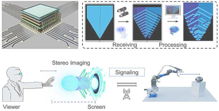 研究团队通过正交CPL发射显示器,同时向佩戴偏光眼镜的双眼传送视差图像,生成具有深度信息的3D图像。基于双眼视差原理,他们建立了一套深度信息检测系统,实现了深度信息的重建和可视化,并支持通过手部动作进行交互操作。