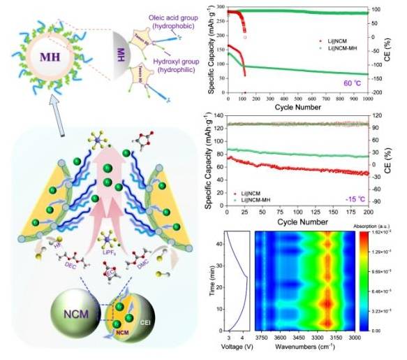 据悉,锂离子电池的宽温域性能,直接决定其在极端环境中的应用表现。研究团队受自然界中动物精子通过鞭毛摆动改变自身周围流场进行移动的现象启发,在锂离子电池正极界面上进行“烷基链摇曳”设计,显著促进界面电解液流动,正极固态电解质界面膜得以快速形成,在能够及时抵御高温下电解液对正极材料攻击的同时,加速低温下高黏度电解液中的锂离子传输,同步提升电池高低温性能。