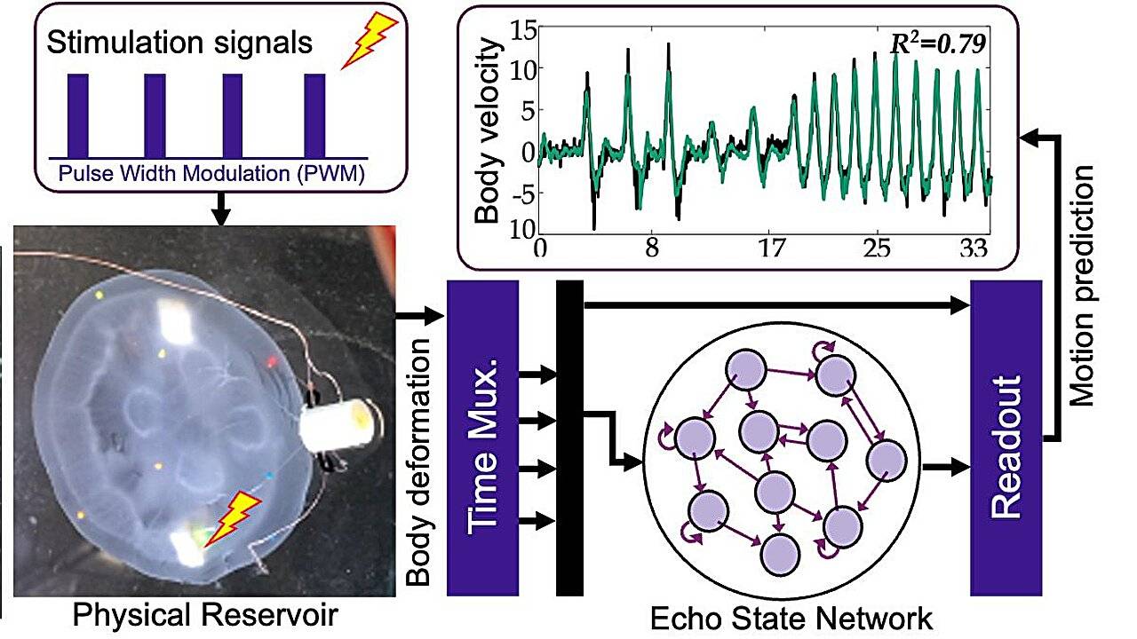 为实现这一目标,研究团队在水母的肌肉环上放置了微型电极,每隔1.5到2秒发出短暂电脉冲,并利用摄像机记录游泳活动,重建三维轨迹。结果显示,最有效的脉冲时间与水母的自然节律相一致,显著提高了游泳速度。这些数据随后被输入到轻量级混合“物理水库”AI模型中,该模型成功预测了水母的游泳速度。
