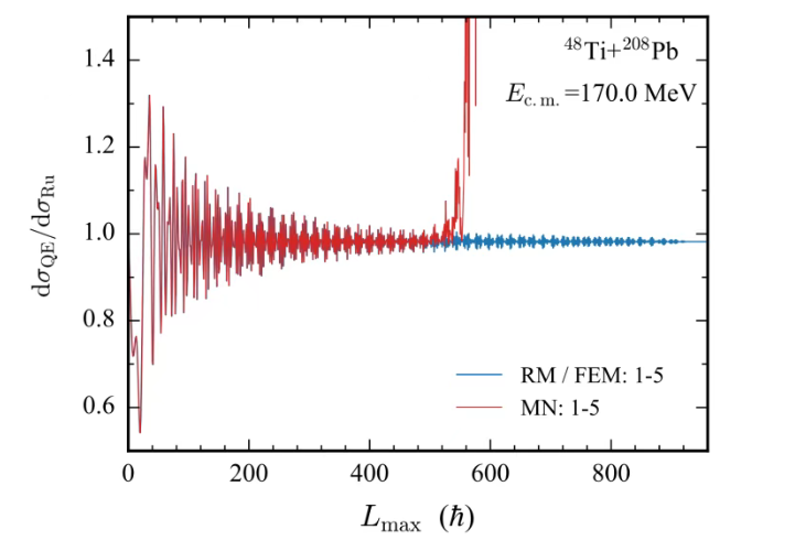 在传统研究中,研究人员一般采用Numerov(MN)差分法模拟相关反应,但面对超重核合成相关复杂的反应体系,这种方法存在严重的数值不稳定问题。为此,原子能院核反应团队与国际合作者创新提出采用RM和FEM求解高维耦合道方程。结果发现,对于重反应体系钛-48和铅-208(48Ti+208Pb),其为达到收敛所需的最高角动量量子数高达约1000,此时理论计算的截面不再随角动量的增加而变化,RM和FEM在计算稳定性与精度方面高度一致,明显优于MN方法。