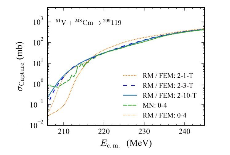 研究人员还对不同耦合方案下钒-51与锔-248(51V + 248Cm)反应体系的俘获截面进行了分析,发现随着靶核中高阶转动态的引入,垒下截面显著增强,表明高自旋态耦合对量子隧穿概率具有显著影响。可以理解为,原子核像“量子陀螺”一样高速旋转,自旋越快,它们绕过能量屏障,直接“穿山而过”的概率就越大。