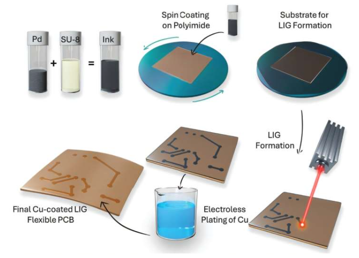 在这项研究中,研究人员利用嵌入聚合物基质中的钯(Pd)纳米颗粒,形成了钯功能化的激光诱导石墨烯。这些钯纳米颗粒作为种子晶体,用于在激光诱导石墨烯支架上进行铜的化学沉积,从而通过激光增材制造工艺形成柔性印刷电路板(f-PCB)的铜互连线。