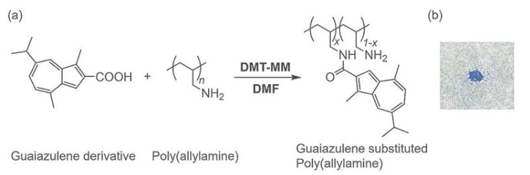 研究小组负责人、东北大学副教授Kouki Oka介绍说:“我们制备了一种含有愈创蓝油烃骨架的羧酸,它可以很容易地与胺发生缩合反应。”通过这一反应,团队成功合成了一种蓝色聚合物,将愈创蓝油烃骨架整合到侧链中。Oka进一步解释道:“通过改变愈创蓝油烃骨架上羧酸的当量,我们可以方便地调节愈创蓝油烃的引入度。”实验结果显示,引入度为3.2%的聚合物的水溶性比单独的愈创蓝油烃高出10,000倍以上。