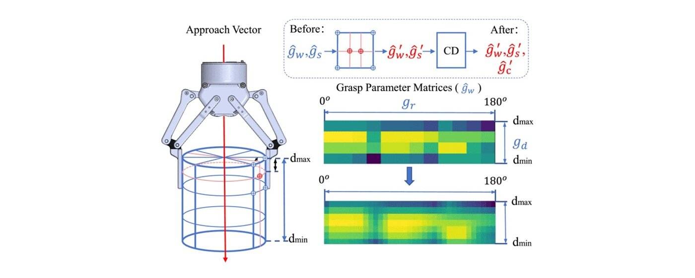 张教授的研究团队最近提出了一个抓握姿势检测框架,该框架利用深度神经网络生成一组丰富的全向(六自由度,简称“6-DoF”)高精度抓握姿势。为了检测待抓握的物体,卷积神经网络(CNN) 被应用于一个半径各异的多尺度圆柱体,提供有关每个物体位置和尺寸估计的详细几何信息。