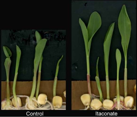 该研究的资深作者、细胞与发育生物学系助理教授Jazz Dickinson表示:“我们发现衣康酸在植物中产生,尤其是在生长细胞中。用衣康酸浇灌玉米植株,幼苗长得更高,这让我们十分兴奋,也激励我们进一步研究这种代谢物,并了解它如何与植物蛋白相互作用。”