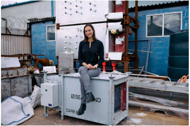 在Seabound的微型庭院工厂,弗雷德里克森展示了装有发电机的原型。她解释道:“我们燃烧燃料,这会产生二氧化碳。”废气通过复杂的管道系统被输送到各种容器中,碳污染被石灰卵石捕获,其他元素则释放到大气中。
