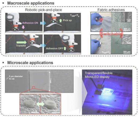 该技术在粘合过程中可提供超过15个大气压的粘合强度,并通过自释放功能实现接近零的剥离力。“开启”和“关闭”状态下的粘合强度差异超过1000倍,比传统方法高出几个数量级。该团队演示了使用机器人系统精确拾取和放置微型LED芯片,并证实即使在纸张和织物等材料上也能实现稳定的粘合。