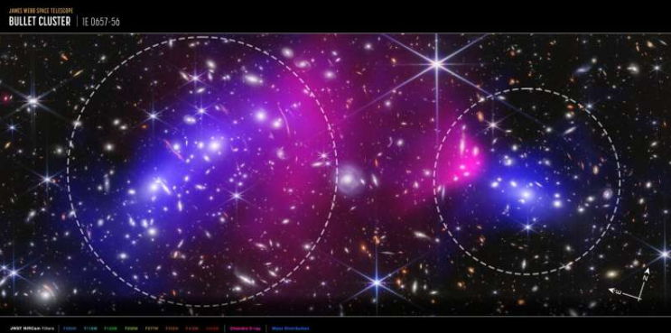 “韦伯的图像极大地改善了测量内容,包括精确定位暗物质的位置,”加州理工学院IPAC的助理科学家凯尔·芬纳说。子弹星系团由两个受引力束缚的巨大星系团组成,它们充当引力透镜,放大背景星系的光,使研究人员能够推断暗物质的分布。研究团队测量了韦伯图像中的数千个星系,精确“称量”了星系团中可见和不可见的质量,并仔细绘制了星系团内恒星发出的集体光。