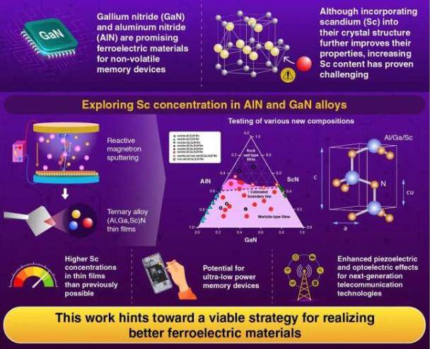 科学家们知道,将钪 (Sc) 添加到这些晶体结构中可以显著降低工作电压,实现超低功耗运行。然而,由于 GaN 和 AlN 的稳定性存在根本限制,增加 Sc 的浓度已被证明极具挑战性。