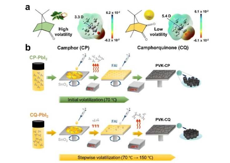 为解决这一问题,研究团队引入樟脑衍生物 CQ 作为添加剂。CQ 经历逐步升华,最初在第一次热处理时协助均匀晶种形成,第二次加热时逐渐完全升华,这种受控升华让钙钛矿薄膜最佳生长且无污染物残留。研究第一作者、研究员 Jeewon Park 称,CQ 能精确定时影响晶体生长阶段且不留残留物,可生产高质量钙钛矿薄膜。