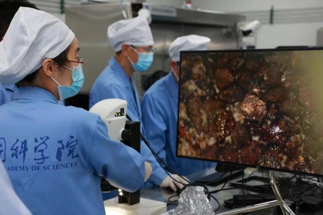 国家天文台科研人员查看岩屑显微镜成像照片。图片来源:中国科学院