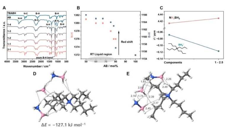研究团队通过物理混合氨硼烷与四丁基硼氢化铵,发现当氨硼烷占比50%至80%时,混合物可形成稳定无定形液体,玻璃化转变温度低至-50°C,远低于室温。光谱分析证实,分子间形成强氢键,打破了原有固体结构,使液体在极低温下仍保持流动性。