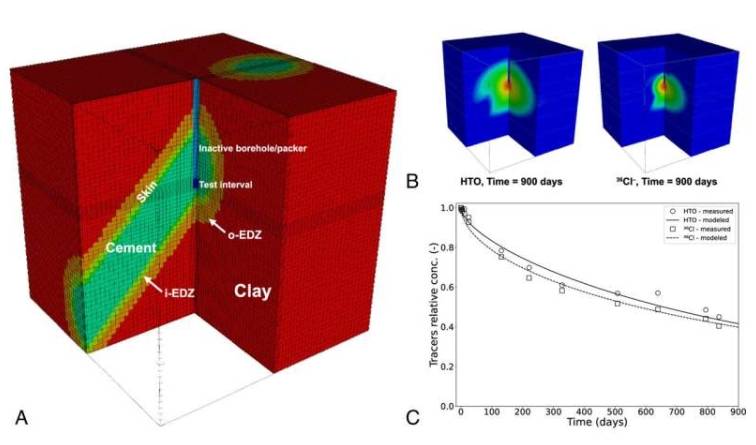 研究团队开发的CrunchODiTi软件首次将静电效应纳入核废料与地质材料相互作用的三维模拟,解决了传统模型因忽略粘土矿物带电特性导致的误差。该软件基于CrunchFlow升级而来,可并行运行于多台高性能计算机,成功复现了瑞士蒙特特里研究站13年实验中水泥-粘土岩界面(“表皮”区域)的放射性核素迁移行为。实验与模拟数据的高度吻合,验证了模型对复杂地质条件下长期反应预测的可靠性。