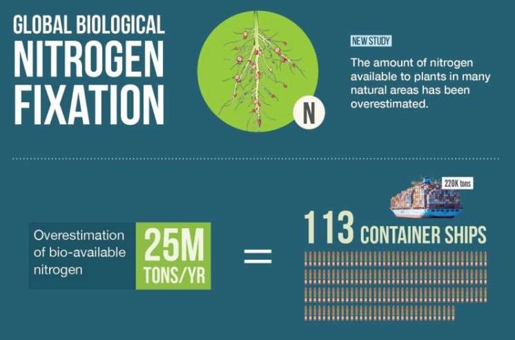 然而,研究发现,包括草原和温带森林在内的许多自然区域,植物可利用的氮含量被高估。由卡拉·雷斯·埃利领导的国际科学家团队量化发现,先前对氮固定量的估计因采样偏差而偏高。实地测量时选取的自然区域固氮生物数量远高于全球平均水平,导致氮可用性估计不准确。