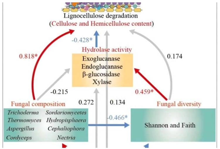 该团队取得多项重要成果。首次揭示了 SynCom 在堆肥高温阶段促进木质纤维素降解的关键机制。接种 SynCom 后,木质素、纤维素和半纤维素含量显著降低,漆酶、锰过氧化物酶、纤维素酶和木聚糖酶等关键降解酶活性提高。宏基因组分析显示,合成的微生物群落增强了与碳水化合物、氨基酸、维生素和能量代谢相关的微生物代谢途径,从基因水平优化了堆肥过程中微生物群落的结构和功能。