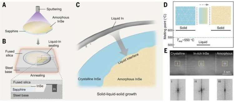 硒化铟,被誉为“金半导体”,因其低有效质量、高热速度和适宜带隙等特性而备受瞩目。然而,由于合成过程中铟和硒原子比难以精确控制,其晶圆级集成一直难以实现。刘开辉教授团队开发的新策略,首先利用磁控溅射在蓝宝石衬底上沉积非晶态InSe薄膜,随后用低熔点铟封装晶圆,加热至约550°C时,铟形成局部富铟环境,促进界面处的可控溶解和重结晶,最终形成了均匀的单相InSe晶体薄膜。这一方法成功生产出2英寸晶圆,其结晶度、相纯度和厚度均匀性均达到二维InSe领域的高水准。