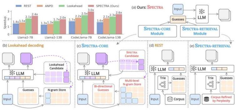 针对此问题,日本先端科学技术大学院大学(JAIST)的Nguyen Le Minh教授及其团队开发了名为SPECTRA的新型推测解码框架。该框架无需额外训练即可加速文本生成。“SPECTRA由两个核心组件构成:SPECTRA-CORE,它可无缝集成到LLM中;以及SPECTRA-RETRIEVAL,它进一步提升性能。”Nguyen教授介绍道。SPECTRA-CORE利用LLM预测的文本分布模式生成高质量猜测,通过双向搜索N-gram词典快速准确预测不同长度短语,并持续更新词典以优化性能。