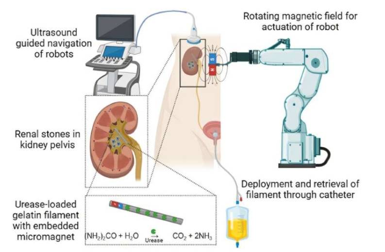 研究团队在真人大小的3D打印模型上测试了这项技术。该系统采用柔软灵活的磁性机器人条带,长度约一厘米,内含尿素酶。医生通过机械臂操控这些微型机器人精准定位结石,尿素酶可降低尿液酸度,促使结石在数天内溶解至可自然排出的尺寸。