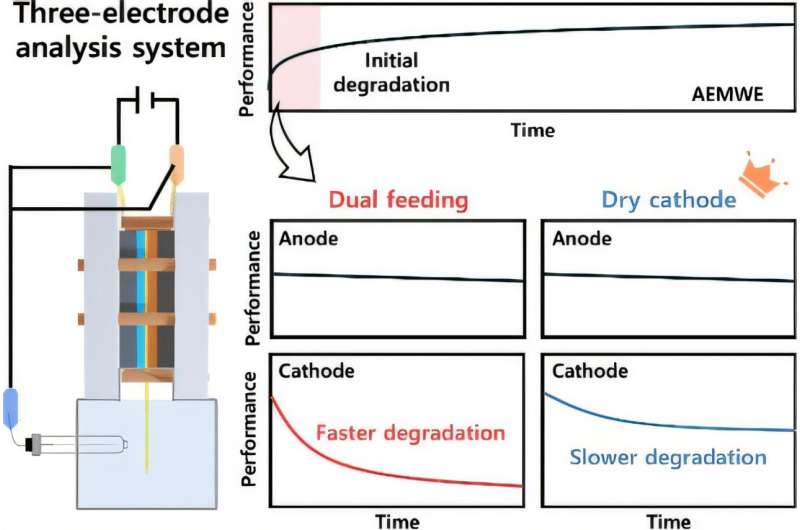 为精准识别性能损失根源,研究团队摒弃传统的两电极测量方法(该方法易混淆电极问题,常将性能损失归咎于阳极),转而采用团队自主研发的新颖三电极分析方法。通过针对性分析,研究团队证实,在干阴极条件下运行可有效缓解早期性能下降问题。