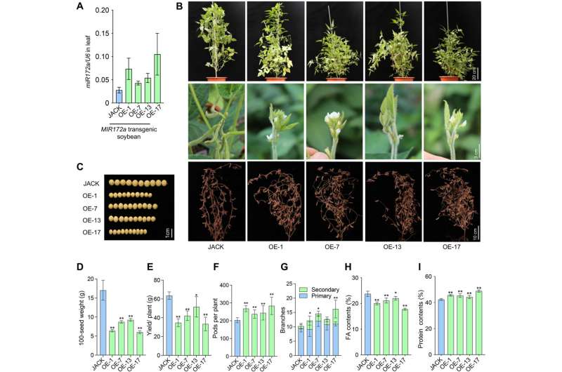 研究揭示了miR172a及其靶基因ERF416/413对大豆种子大小、重量、油和蛋白质含量的影响机制。研究发现,miR172a直接影响种子形态与成分:过表达MIR172a会使种子显著变小变轻,改变脂肪酸组成,降低棕榈酸、硬脂酸、油酸和亚油酸含量,增加亚麻酸含量,同时蛋白质含量上升。