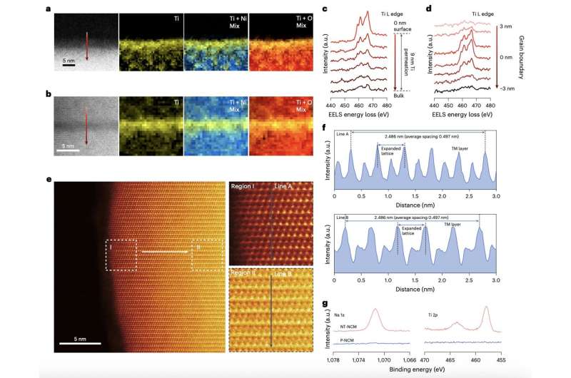 本质上,研究人员提出将钛离子 (Ti 4+ ) 与钠离子 (Na + ) 配对,在富镍阴极上形成一层富含 Ti⁴⁺ 的薄表面层。研究发现,阴极材料表面的高 Ti⁴⁺ 浓度可以增强材料的结构完整性,从而限制可能导致材料降解的不良副反应。