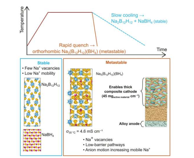 研究采用氢硼酸钠材料,通过加热再快速冷却的成熟工艺,获得了一种亚稳态晶体结构。该结构具有较高的离子电导率,比文献记载的数值提升了一个数量级。第一作者Sam Oh表示:“我们稳定了一种从未被报道过的亚稳态结构,其离子电导率比前体本身高出三到四个数量级。”